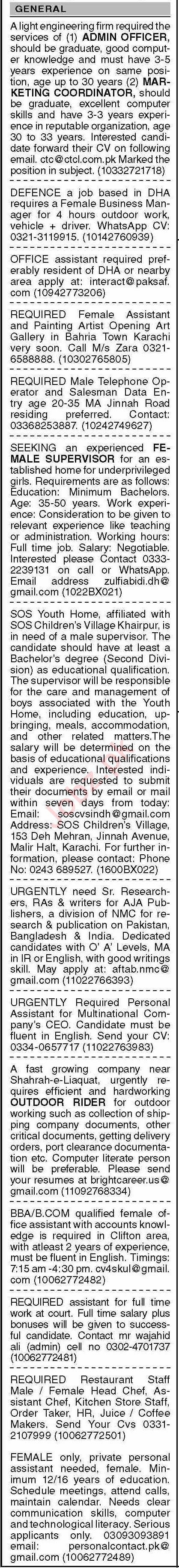 Private Company Karachi, karachi Sindh Pakistan invites applications from eligible candidates for the post of admin officer, painting artist, order taker, business manager, assistant chef, coffee maker, outdoor rider, kitchen store staff, restaurant staff, telephone operator, marketing coordinator, female assistant, rider, hr staff, head chef, female business manager, office assistant, accountant, pa, personal assistant, chef, data entry operator, female supervisor, juice maker, supervisor, writer and researcher as per advertisement of November 6, 2023 published in daily Dawn Newspaper. Preferred Education is Intermediate, B.com, Matric, Middle, BA, Bachelor, BBA and I.com etc.