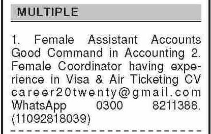 Vacant posts including female assistant accounts, female coordinator, coordinator and assistant accounts are announced in Private Company Karachi, karachi Sindh Pakistan as per 6 October 2025 advertisement in daily Dawn Newspaper. Preferred Education is B.com, Bachelor, BA and Others etc.