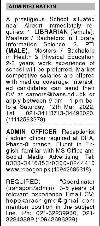 Vacant posts including pti, female librarian, librarian, receptionist, coordinator, coordinator transport, coordinator admin and admin officer are announced in Private Company Karachi, karachi Sindh Pakistan as per 7 March 2022 advertisement in daily Dawn Newspaper. Candidates with Intermediate, Matric and Bachelor etc. educational background will be preferred.