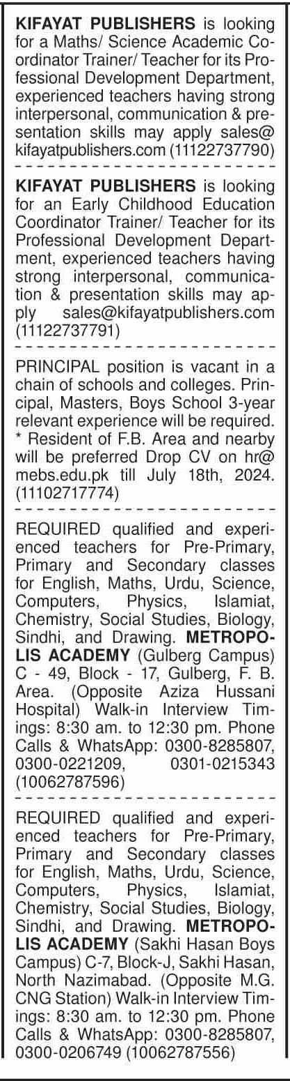 Private School latest Classifieds Teaching jobs and others can be applied till 22 July 2024 or as per closing date in newspaper ad. Read complete ad online to know how to apply on latest Private School job opportunities. Learn today extra skills including Teaching/Lecturing, Education & Tutoring, Mathematics, Chemistry Tutoring, Physics Tutoring and English Teaching to get these Private School jobs.