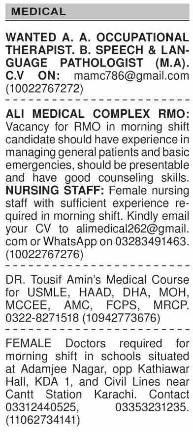 Hospital Clinic jobs advertisement dated about 8 July 2024 in daily Dawn Newspaper invites application for the vacant post of occupational therapist, nurse, pathologist, nursing staff, rmo, female doctor, resident medical officer, speech therapist and doctor in Karachi, karachi Sindh Pakistan. Persons with Bachelor, MBBS, DAE, Others, Intermediate and Matric etc. education can apply.