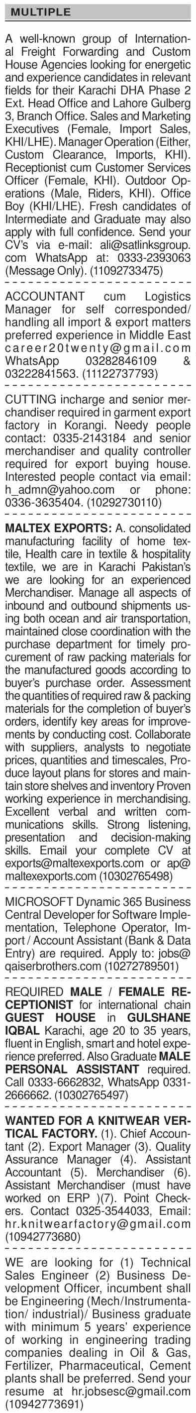 Private Company jobs advertisement dated about 8 July 2024 in daily Dawn Newspaper invites application for the vacant post of cutting incharge, sales executive, rider, sales manager, logistics manager, pa, industrial engineer, merchandiser, business development officer, outdoor staff, instrumentation engineer, accountant, point checker, account assistant, assistant accountant, export manager, office boy, import manager, mechanical engineer, receptionist, chief accountant, assistant merchandiser, female receptionist, data entry operator, marketing executive, customer services officer, personal assistant, quality assurance manager, telephone operator, technical sales engineer and manager operation in Karachi, lahore Sindh Pakistan. Persons with B.E, DAE, Bachelor, Intermediate and Matric etc. education can apply.