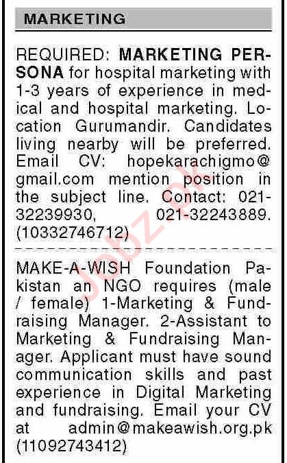 Marketing Company is looking for candidates for following posts as per job advertisement published in daily Dawn Newspaper of May 8, 2023 for location Karachi, karachi Sindh Pakistan: