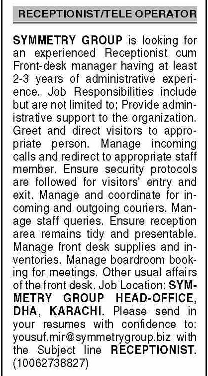 Symmetry Group Karachi, karachi Sindh Pakistan invites applications from eligible candidates for the post of front desk manager, telephone operator and receptionist as per advertisement of January 9, 2023 published in daily Dawn Newspaper. Persons with Bachelor and Intermediate etc. education can apply.