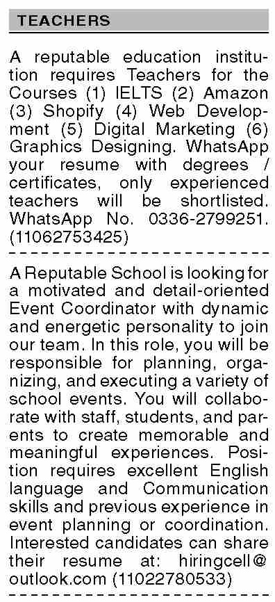 Private School Karachi, karachi Sindh Pakistan invites applications from eligible candidates for the post of digital marketing officer, event coordinator, teacher, it instructor, ielts teacher, shopify developer, web developer and female teacher as per advertisement of September 9, 2024 published in daily Dawn Newspaper. Educational qualifications required MA, M.sc, BCS, Bachelor and Master etc.