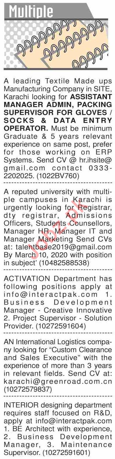 Dawn Sunday Classified Ads 8th March 2020 for Multiple Staff