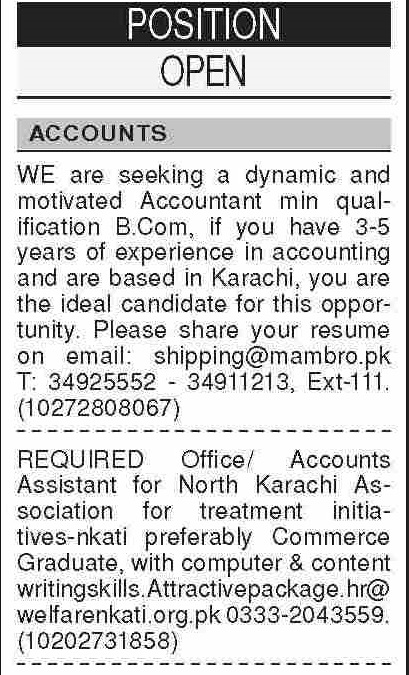 Private Company jobs advertisement dated about 9 December 2024 in daily Dawn Newspaper invites application for the vacant post of accountant, accounts assistant and office assistant in Karachi, karachi Sindh Pakistan. B.com and BBA etc. educational qualification will be preferred.