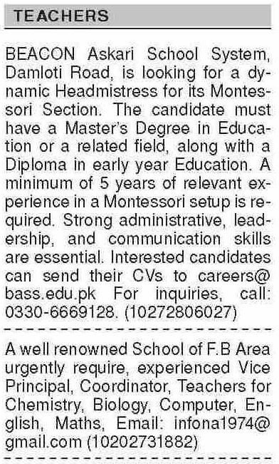 Private School Karachi, karachi Sindh Pakistan invites applications from eligible candidates for the post of chemistry teacher, english teacher, coordinator, female teacher, vice principal, maths teacher, computer teacher, biology teacher, teacher and headmistress as per advertisement of February 10, 2025 published in daily Dawn Newspaper. Bachelor, M.sc, Master and MA etc. educational qualification will be preferred.
