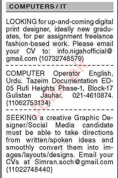 Dawn Sunday Classified Ads 9 July 2023 for Computer Staff