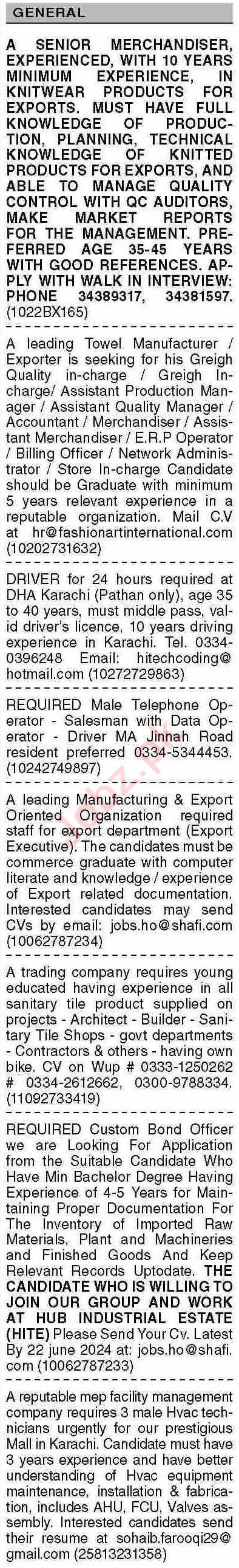 Private Company is looking for candidates for following posts as per job advertisement published in daily Dawn Newspaper of June 10, 2024 for location Karachi, karachi Sindh Pakistan:
