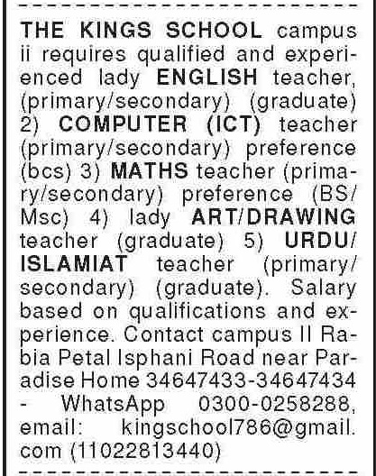 The Kings School invites applications for job positions advertised in daily Dawn dated 10 November 2025 for following vacancies in Karachi, karachi Sindh Pakistan.