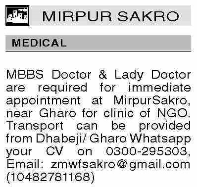 Non Governmental Organization NGO Karachi, karachi Sindh Pakistan invites applications from eligible candidates for the post of mbbs doctor, doctor and lady doctor as per advertisement of August 19, 2024 published in daily Dawn Newspaper. Educational qualifications required Others and MBBS etc.