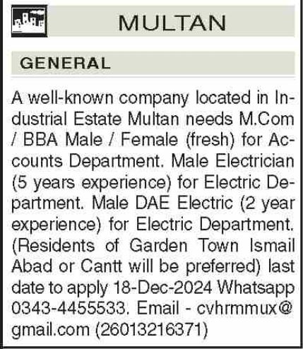 Private Company is looking for candidates for following posts as per job advertisement published in daily Dawn Newspaper of December 9, 2024 for location Multan, multan Punjab Pakistan: