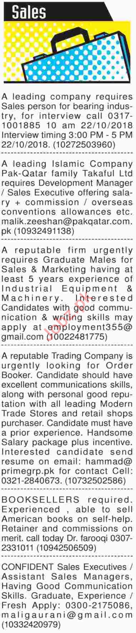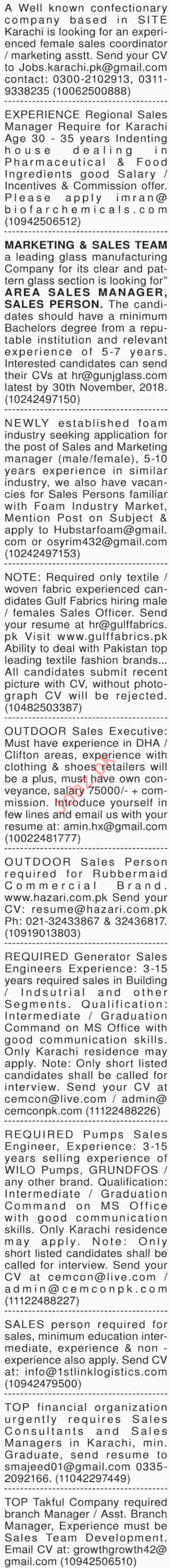Field professional and talented personnel for the posts of Salesperson, Salesman, Development Manager, Sales Executive, Marketing Executive, Order Booker, Bookseller, Assistant Sales Manager, Sales Engineer, Branch Manager required for a leading companies in Karachi.