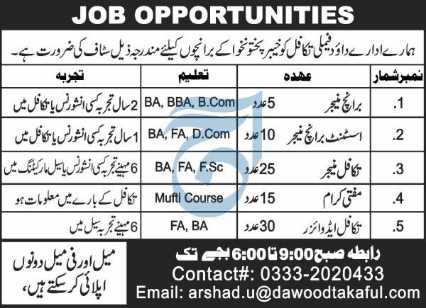Dawood family takaful invites applications for job positions advertised in daily Aaj dated 13 September 2022 for following vacancies in Peshawar, peshawar Khyber Pakhtunkhwa KPK Pakistan.