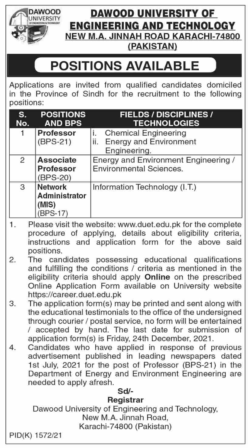 Vacancies in Dawood University of Engineering & Technology Advertisement December 2021