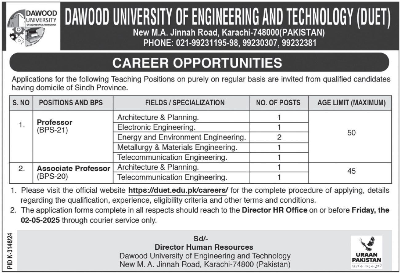Latest Teaching jobs and others Government jobs in Dawood University of Engineering & Technology closing date is around May 2, 2025, see exact from ad. Read complete ad online to know how to apply on latest Dawood University of Engineering & Technology job opportunities.