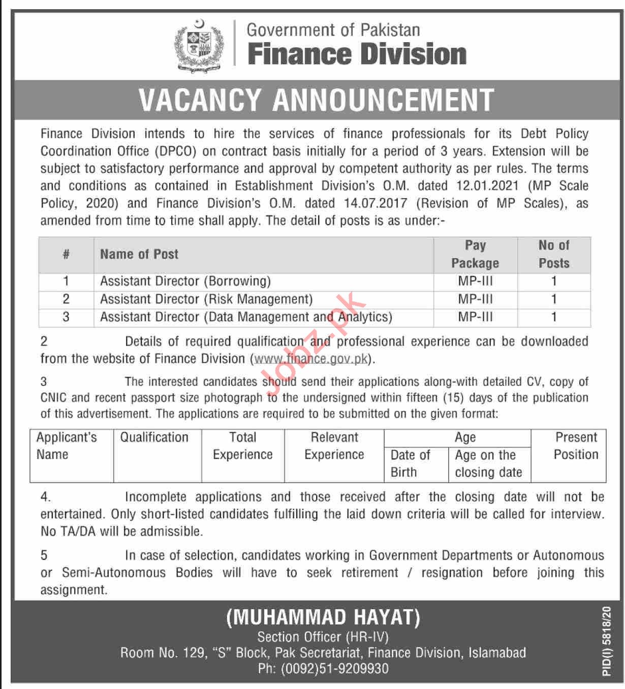 Debt Policy Coordination Office DPCO Islamabad, Finance Division, Government of Pakistan is seeking candidates for the posts of Assistant Director, Assistant Director Borrowing, Assistant Director Risk Management, Assistant Director Analytics, Assistant Director Data Management.
