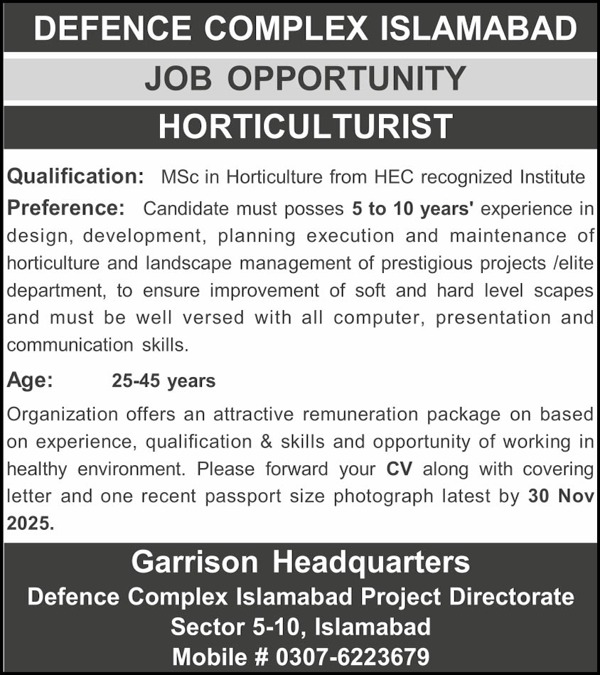 Defence Complex jobs advertisement dated about 28 November 2025 in daily Pakistan Observer Newspaper invites application for the vacant post of horticulturist in E-10 Islamabad, islamabad Islamabad Pakistan. Candidates with M.sc etc. educational background will be preferred.