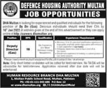 Vacant posts including Deputy Director Gas are announced in Defence Housing Authority DHA Multan Punjab Pakistan as per 9 January 2022 advertisement in daily Dunya Newspaper. Preferred Education is Bachelor and Master etc.