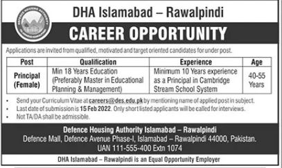 Defence Housing Authority DHA jobs advertisement dated about 6 February 2022 in daily The News Newspaper invites application for the vacant post of principal in Rawalpindi Punjab Pakistan. Candidates with Master etc. educational background will be preferred.