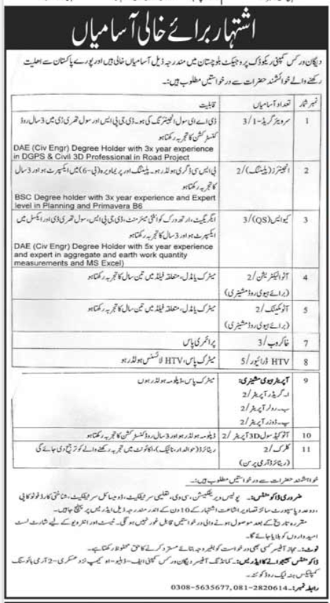 Degan Works Company jobs advertisement dated about 9 July 2025 in daily Jang Newspaper invites application for the vacant post of operator heavy machinery, htv driver, engineer, auto electrician, auto mechanic, clerk, khakrob, surveyor and qs in Quetta, quetta Balochistan Pakistan. Educational qualifications required Matric, Intermediate and Middle etc.