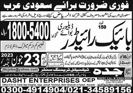 Jeddah Technical Trade Center jobs advertisement dated about 21 June 2023 in daily Express Newspaper invites application for the vacant post of rider, bike rider and delivery boy in Riyadh, jeddah Saudi Arabia. Educational qualifications required Matric and Intermediate etc.