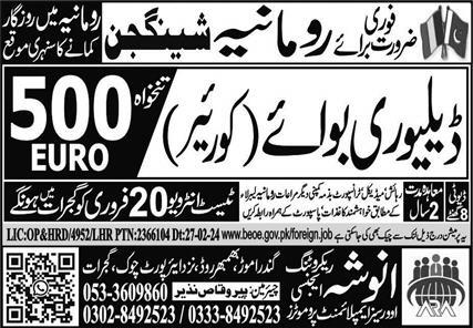 Anoosha Recruiting Agency Romania, romania Romania invites applications from eligible candidates for the post of delivery boy and courier boy as per advertisement of February 19, 2025 published in daily Express Newspaper. Matric and Intermediate etc. educational qualification will be preferred.