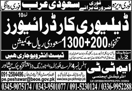 MTT International Agency jobs advertisement dated about 8 April 2025 in daily Express Newspaper invites application for the vacant post of car driver, ltv driver, delivery car driver and driver in Jeddah, dammam Saudi Arabia. Intermediate and Matric etc. educational qualification will be preferred.