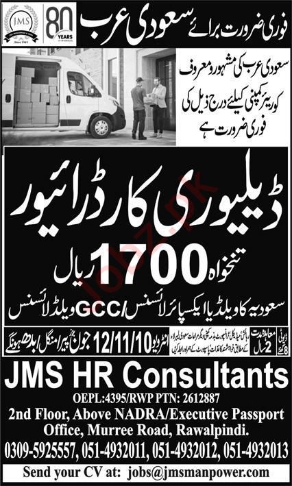 JMS HR Consultant OEP jobs advertisement dated about 9 June 2024 in daily Express Newspaper invites application for the vacant post of delivery car driver in Riyadh, riyadh Saudi Arabia. Intermediate, Middle and Matric etc. educational qualification will be preferred.