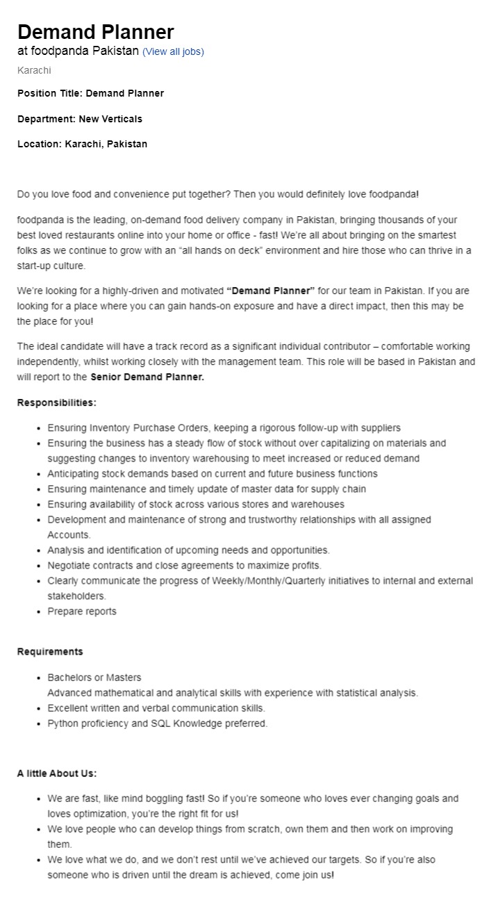 Vacant posts including demand planner are announced in Foodpanda Karachi, karachi Sindh Pakistan as per 20 September 2023 advertisement in daily Other Newspaper. Preferred Education is Master and Bachelor etc.