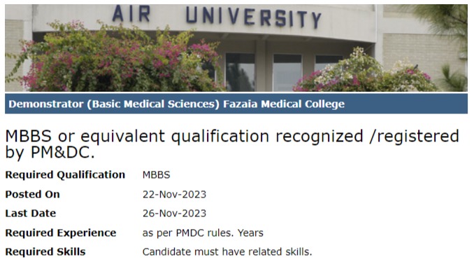 Fazaia Medical College, Air University Islamabad, islamabad Islamabad Pakistan invites applications from eligible candidates for the post of demonstrator basic medical sciences and demonstrator as per advertisement of November 22, 2023 published in daily Other Newspaper. Educational qualifications required MBBS and Others etc.