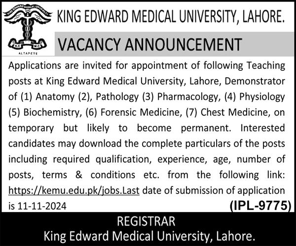 King Edward Medical University jobs advertisement dated about 25 October 2024 in daily Nawaiwaqt Newspaper invites application for the vacant post of demonstrator in Lahore, lahore Punjab Pakistan. Candidates with MBBS and Others etc. educational background will be preferred.