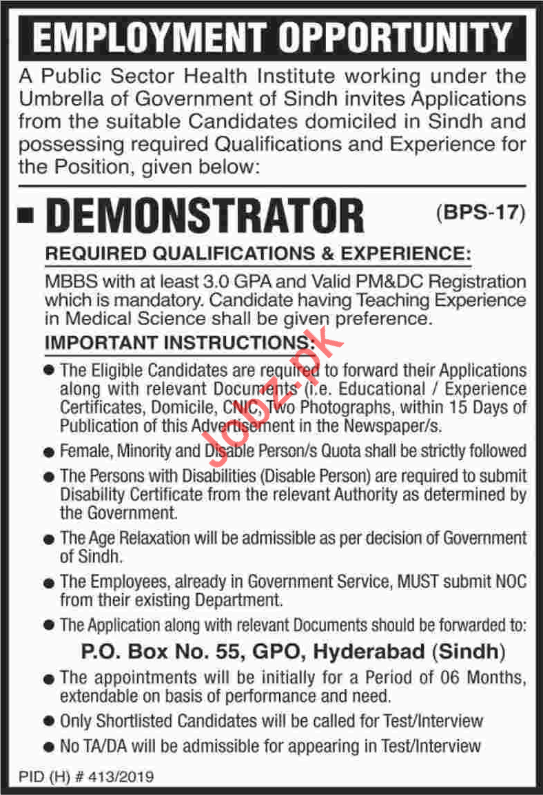 Apply as per details in job advertisement. Login to view further details of how to apply via https://www.jobz.pk online.