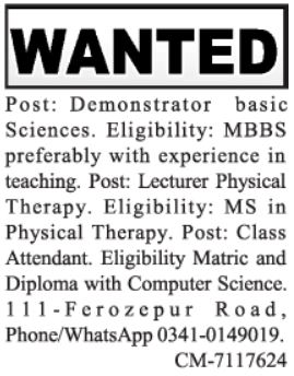 Demonstrator & Lecturer Jobs 2022 in Lahore