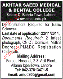 Demonstrators Job In Akhtar Saeed Medical & Dental College