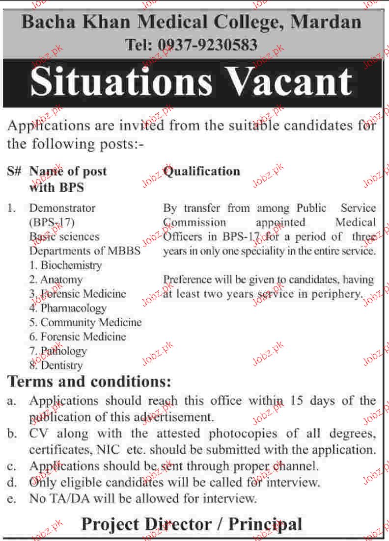 Demonstrators Job In Bacha Khan Medical College Mardan