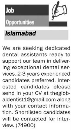 Dental Clinic is looking for candidates for following posts as per job advertisement published in daily The News Newspaper of July 11, 2023 for location Islamabad, islamabad Islamabad Pakistan: