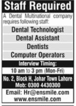 Dental Multinational Company Lahore, lahore Punjab Pakistan invites applications from eligible candidates for the post of dental technologist, dental assistant, dentist and computer operator as per advertisement of May 15, 2022 published in daily Jang Newspaper. BDS, Bachelor and Master etc. educational qualification will be preferred.
