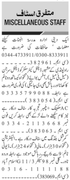 Private Company Islamabad, rawalpindi Islamabad Pakistan invites applications from eligible candidates for the post of mali, dental surgeon, office boy, ac mechanic, hafiza, gardener, electrician, plumber and quran teacher as per advertisement of April 19, 2024 published in daily Jang Newspaper. Persons with Middle, Intermediate, BDS, Matric and BA etc. education can apply.