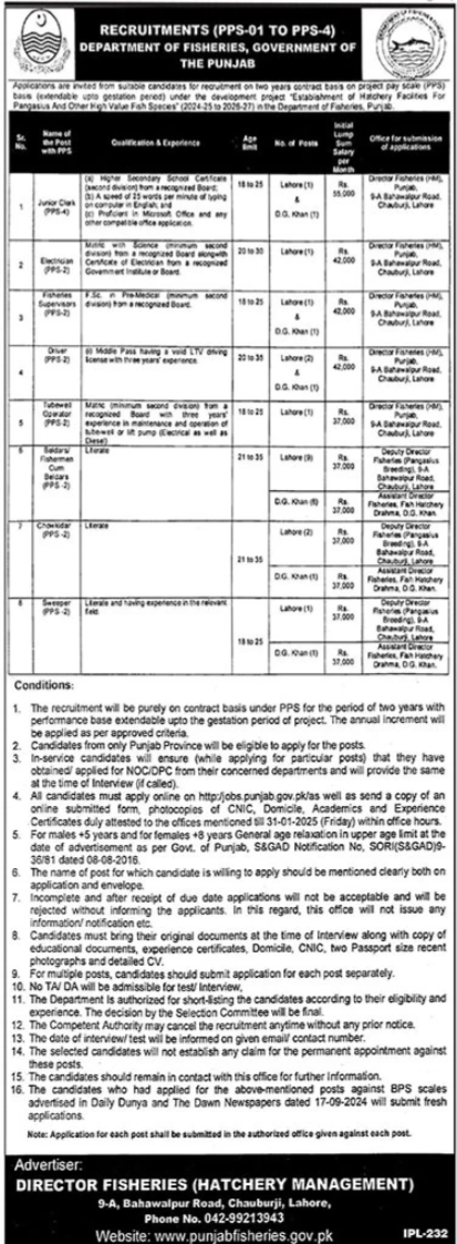 Vacant posts including sweeper, fisherman, chowkidar, fisheries supervisor, ltv driver, driver, clerk, electrician, baildar and tubewell operator are announced in Department of Fisheries Lahore, lahore Punjab Pakistan as per 18 January 2025 advertisement in daily The News Newspaper. Preferred Education is Intermediate, Middle, Matric and Primary etc.