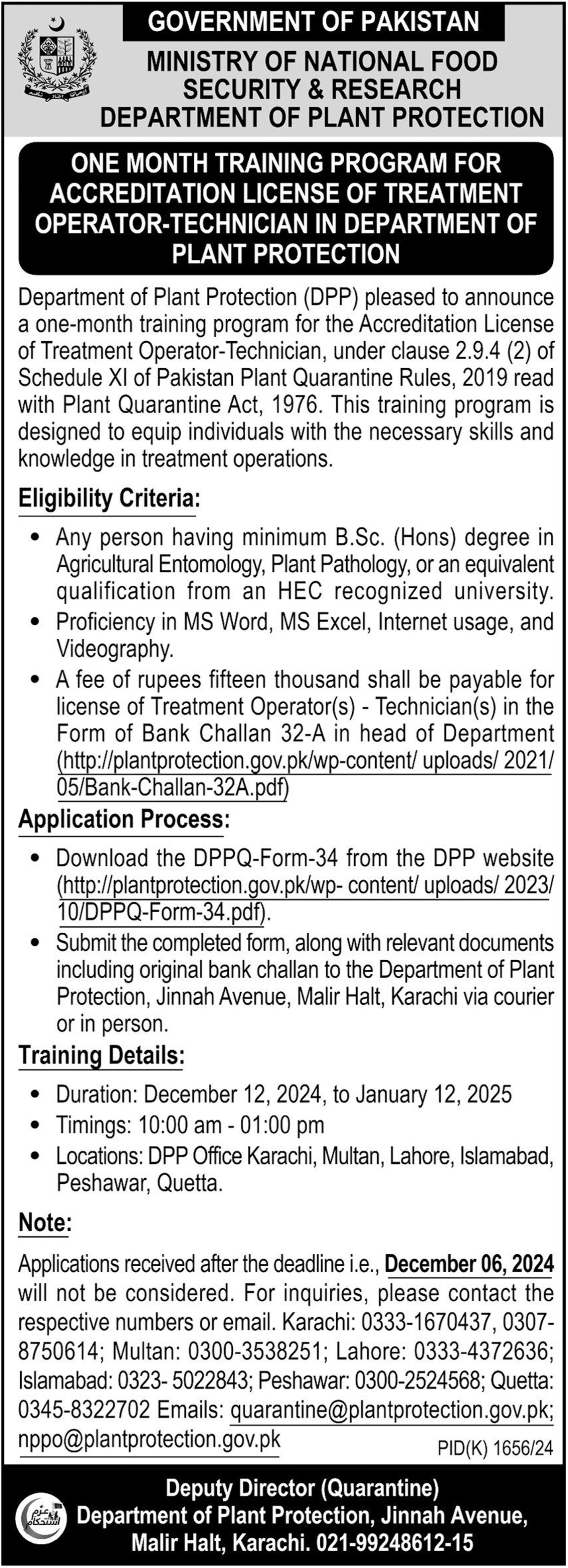 Ministry of National Food Security & Research MNFSR Karachi, multan, peshawar, quetta, islamabad and lahore Sindh Pakistan invites applications from eligible candidates for the post of treatment technician and treatment operator as per advertisement of November 28, 2024 published in daily Other Newspaper. Educational qualifications required Others etc.