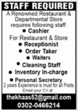 A renowned Restaurant & Departmental Store located in Lahore is urgently looking for professional qualified, experienced and highly motivated candidates for the vacant positions of Cashier, Receptionist, Order Taker, Waiter, Cleaning Staff, Inventory Incharge, Personal Secretary.