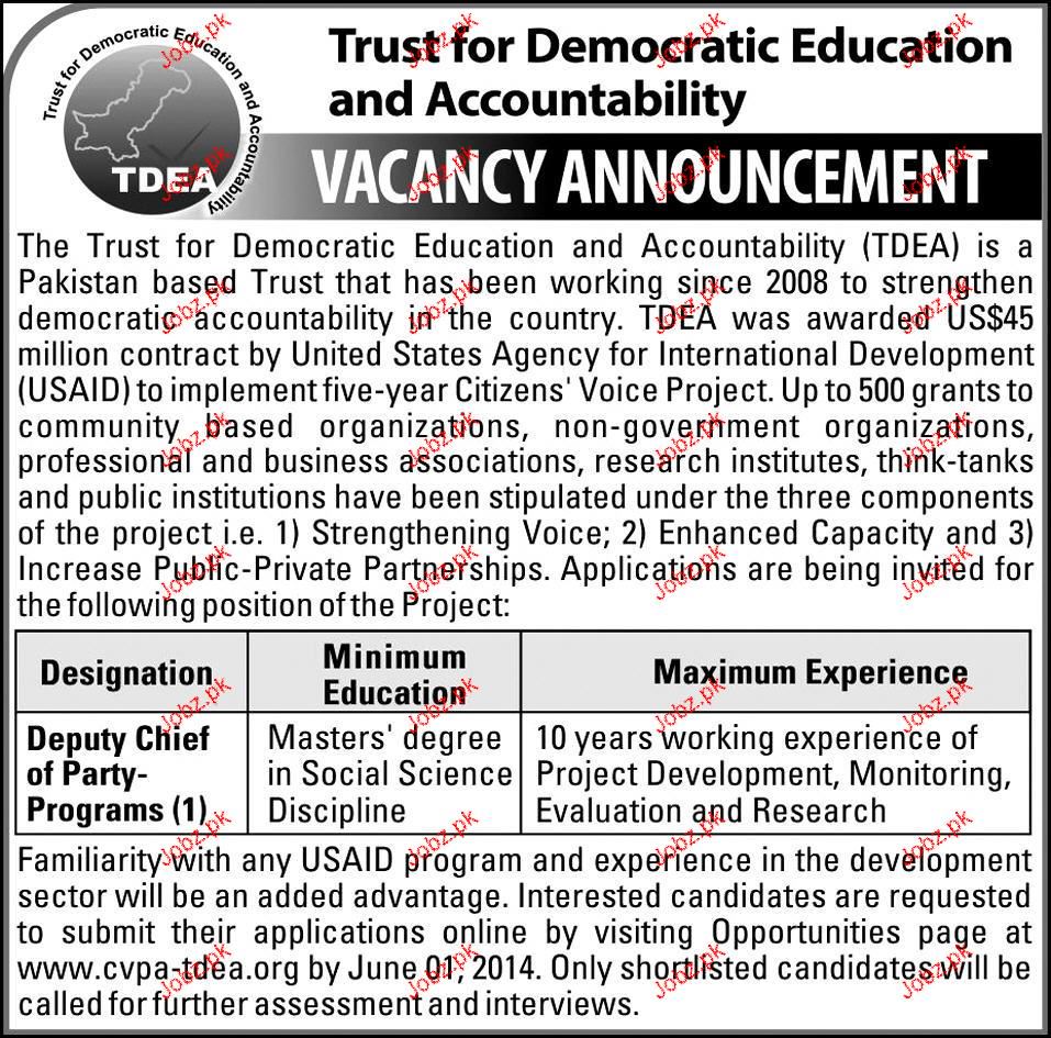 Deputy Chief of Party Programs is required in Trust Democratic Education and Accountability in Karachi.
