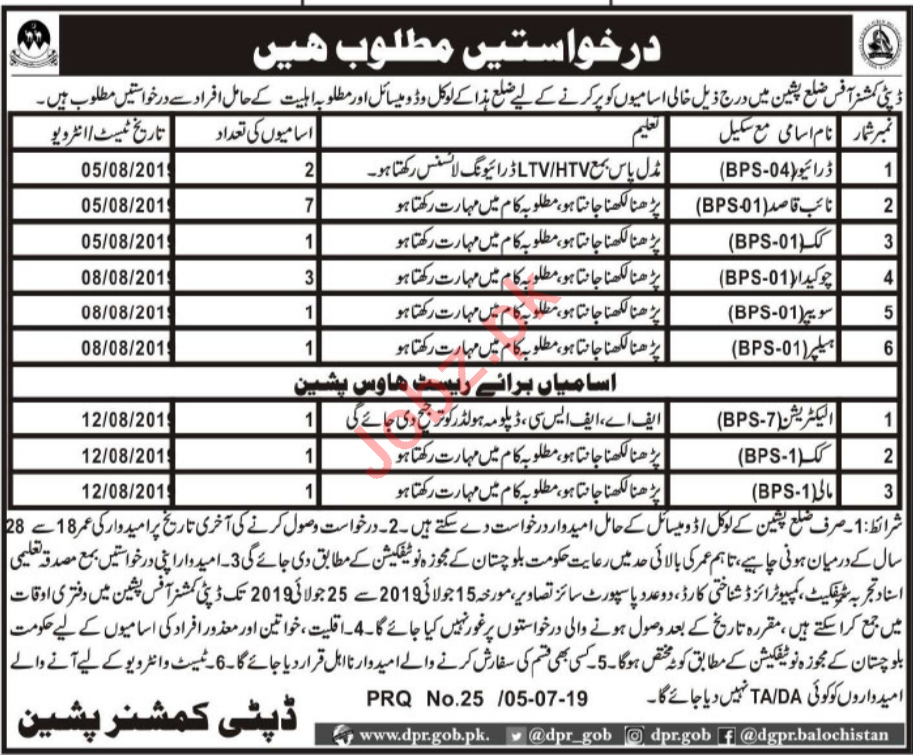 A Well-Known Government Organization Deputy Commissioner District Office in Pashteen Balochistan is looking for qualified, expert and Well-Mannered staff for their Organization for the Job of Driver, Naib Qasid, Cook, Sweeper, Chowkidar, Helper, Electrician and Mali.