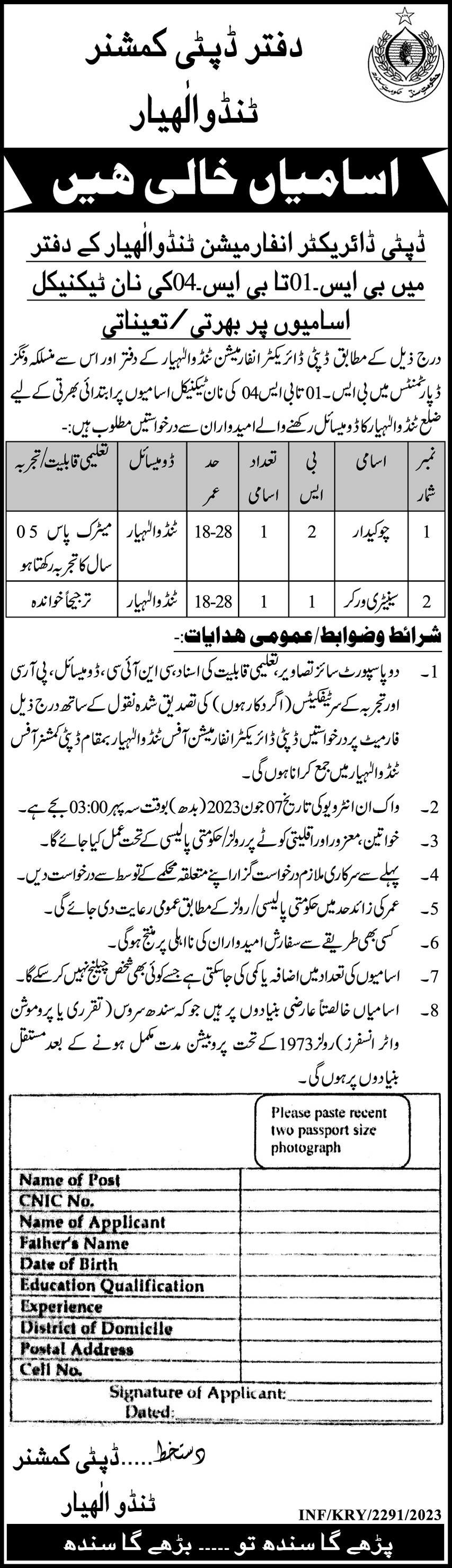 Deputy Commissioner District Office jobs advertisement dated about 2 June 2023 in daily Express Newspaper invites application for the vacant post of sanitary worker and chowkidar in Tando Allahyar, tando allahyar Sindh Pakistan. Educational qualifications required Matric and Primary etc.