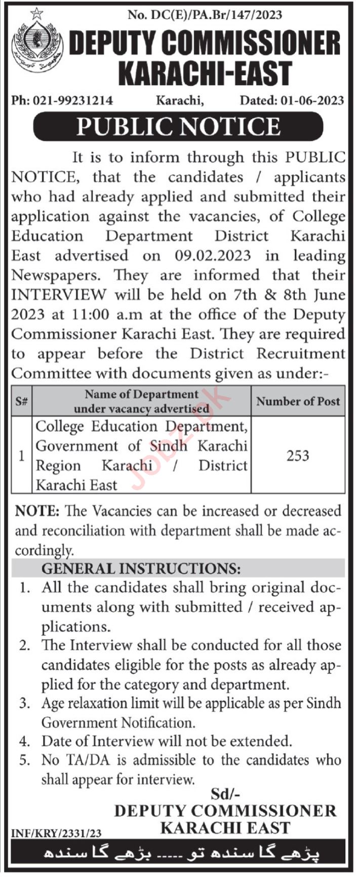 Latest Deputy Commissioner Office Management Posts Karachi 2025