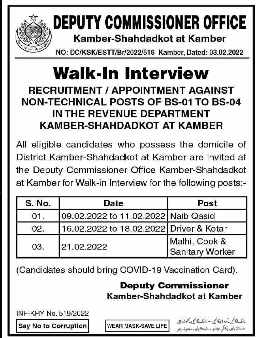 Deputy Commissioner District Office invites applications for job positions advertised in daily Dawn dated 6 February 2022 for following vacancies in Larkana Sindh Pakistan.