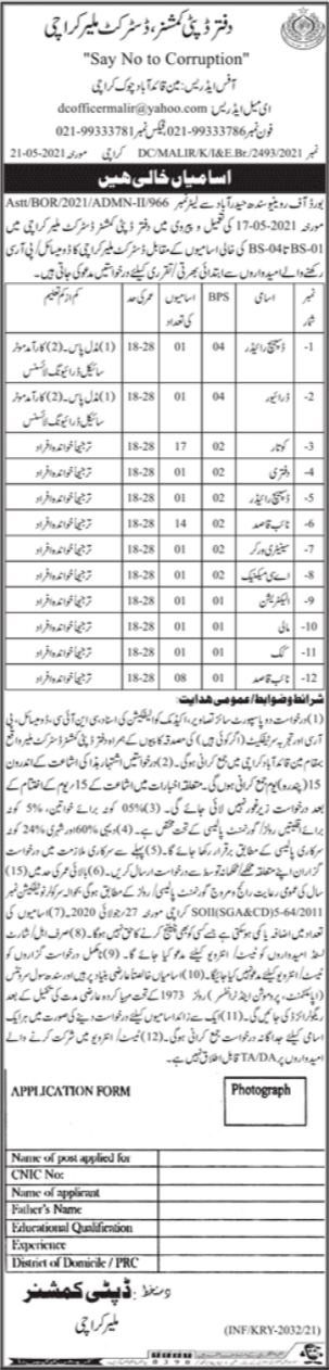 Deputy Commissioner Office invites applications from highly educated expert and experienced professional for the post of Dispatch Rider, Driver, LTV Driver, HTV Driver, Kotar, Daftri, Naib Qasid, Sanitary Worker, AC Mechanic, Electrician, Malhi, Cook in Malir cantt Karachi.