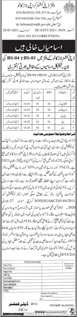 Deputy Commissioner Office Larkana Non Technical Jobs 2021